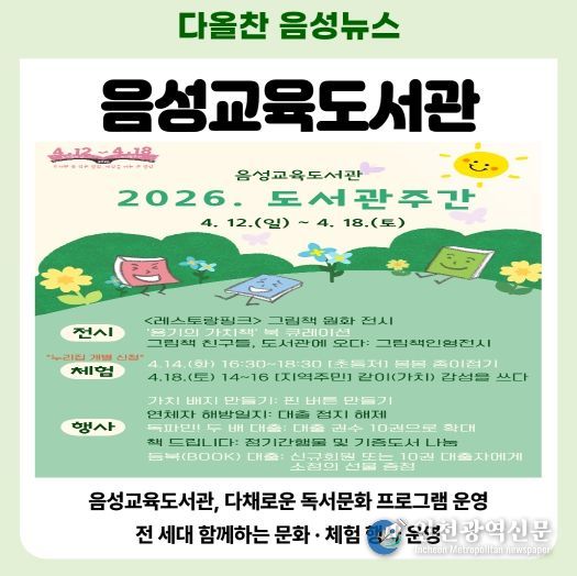 [인천광역신문] 최예준 기자 | 음성교육도서관은 제62회 도서관주간을 맞아 4월 12일부터 4월 18일까지 ‘도서관 속 작은 펼침, 세상을 여는 큰 열림’을 주제로 유아, 학생, 학조부모 및 지역주민 등 전 연령층이 함께 참여할 수 있는 다양한 독서문화 프로그램을 운영한다.