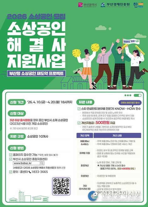 [인천광역신문] 최예준 기자 | 부산시(시장 박형준)와 (재)부산경제진흥원은 오늘(10일)부터 오는 4월 20일까지 '소상공인 해결사 지원사업'에 참여할 지역 음식점업 소상공인을 모집한다고 밝혔다.