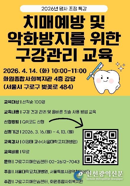 참여 대상은 치매 예방과 구강 건강에 관심 있는 주민 선착순 100명이며 교육비는 무료다. 신청은 홍보물 내 QR코드를 통해 가능하며, 자세한 사항은 구로구치매안심센터로 문의하면 된다.