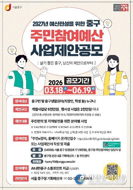 [인천광역신문] 최예준 기자 | 서울 중구가 2027년 주민참여예산 사업 제안을 오는 6월 19일까지 접수한다. 주민참여예산에 대한 이해도를 높이기 위한 예산학교는 올해 기초 및 심화 과정으로 확대해 운영한다.