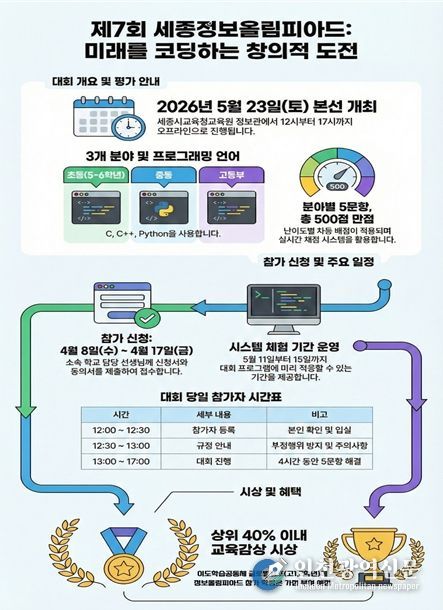 [인천광역신문] 최예준 기자 | 세종특별자치시교육청은 학생들의 논리적 사고력과 창의적 문제해결력을 함양하기 위해 ‘제7회 세종정보올림피아드 대회’를 개최한다.