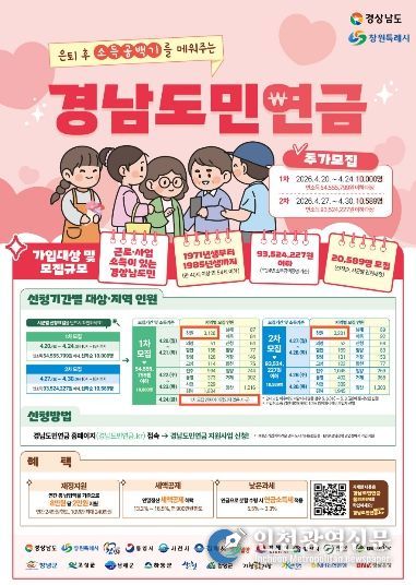 [인천광역신문] 최예준 기자 | 창원특례시는 은퇴 후 국민연금 수령 전까지 소득공백기 대비와 노후준비 지원을 위해 지난 1월 ‘경남도민연금’ 가입자 모집에 이어 4월 추가모집을 시행한다고 밝혔다.
