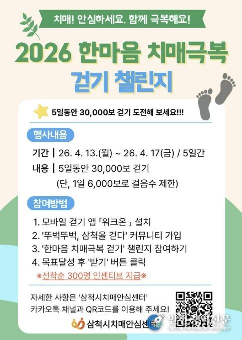[인천광역신문] 최예준 기자 | 삼척시보건소 치매안심센터가 치매 예방에 좋은 ‘걷기’를 실천해 치매에 대한 인식을 개선하고 치매 극복을 기원하기 위해 오는 4월 13일부터 17일까지 5일간 '2026 한마음 치매극복 걷기 챌린지'를 운영한다.