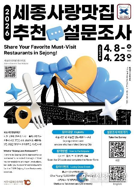 [인천광역신문] 최예준 기자 | 세종시문화관광재단은 지역 대표 맛집 발굴을 위해 4월 8일부터 23일까지 ‘2026 세종사랑맛집’ 선정을 위한 시민 참여형 설문조사를 실시한다고 밝혔다.