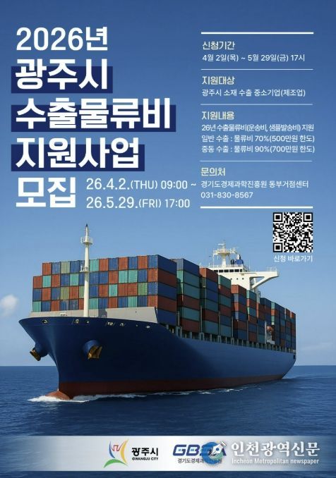 [인천광역신문] 최예준 기자 | 광주시와 경기도경제과학진흥원은 지역 내 중소기업의 수출 경쟁력 강화를 위한 ‘광주시 수출물류비 지원사업’ 참여 기업을 4월 2일부터 5월 29일까지 모집한다고 10일 밝혔다.
