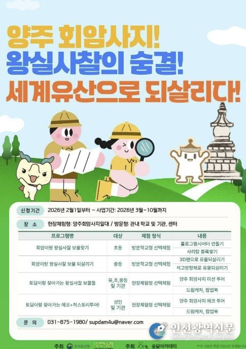 [인천광역신문] 최예준 기자 | 양주시립회암사지박물관은 복권기금으로 운영되는 지역 국가유산 교육 활성화 사업의 일환으로, 양주 회암사지의 역사와 주변 문화유산을 주제로 한 교육 프로그램 ‘양주 회암사지! 왕실사찰의 숨결! 세계유산으로 되살리다’를 운영한다.