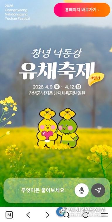 [인천광역신문] 최예준 기자 | 창녕군은 창녕낙동강유채축제 방문객에게 실시간 축제 정보와 맞춤형 관광 안내를 제공하는 인공지능(AI) 안내 서비스를 도입했다고 밝혔다.