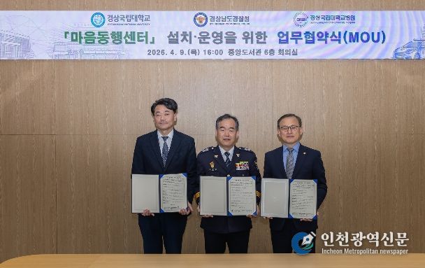 [인천광역신문] 최예준 기자 | 경상국립대학교, 경남경찰청, 경상국립대학교병원이 국가 치안을 책임지는 경찰관들의 정신 회복과 마음건강 증진을 위해 힘을 모으기로 했다. 세 기관은 4월 9일 오후 4시 경상국립대학교 가좌캠퍼스 중앙도서관 6층 회의실에서 ‘마음동행센터’ 신설 및 운영을 위한 업무협약을 체결했다.