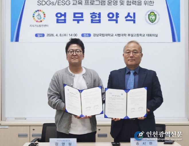 [인천광역신문] 최예준 기자 | 경상국립대학교 지속가능발전센터와 경상국립대학교 사범대학 부설고등학교는 4월 8일 오후 부설고등학교 대회의실에서 ‘SDGs/ESG 교육 프로그램 운영 및 협력을 위한 업무협약’을 체결했다.