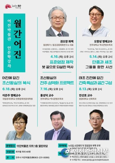 [인천광역신문] 최예준 기자 | 전주시 어진박물관은 4월부터 오는 8월까지 매월 셋째 주 목요일 인문학 강좌인 ‘월간어진’을 운영한다고 10일 밝혔다.