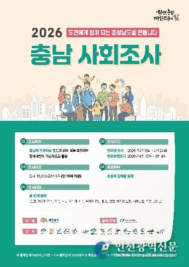 [인천광역신문] 최예준 기자 | 논산시는 오는 4월 13일부터 5월 4일까지 관내 1,020가구의 만 15세 이상 가구주 및 가구원을 대상으로 ‘2026 충남사회조사’를 실시한다.