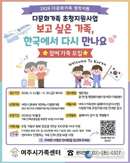 [인천광역신문] 최예준 기자 | 여주시가족센터는 결혼이민자의 원가족을 한국으로 초청해 가족 간의 유대감을 높이고 상호이해를 돕는 '다문화가족 초청지원사업' 참여 가족을 모집한다.