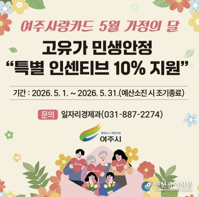 [인천광역신문] 최예준 기자 | 여주시는 최근 중동 정세 악화에 따른 물가상승 압력이 높아짐에 따라 민생안정 대책으로 오는 5월 가정의 달 ‘여주사랑카드 특별 인센티브 10%’ 지원을 한다고 밝혔다.