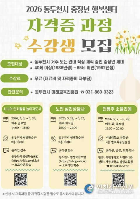 [인천광역신문] 최예준 기자 | 동두천시 미래교육진흥원은 지역 내 중장년층의 성공적인 인생 2막과 안정적인 사회 참여를 지원하기 위해 ‘2026년 중장년 행복센터 자격증 과정’ 수강생을 모집한다고 밝혔다.