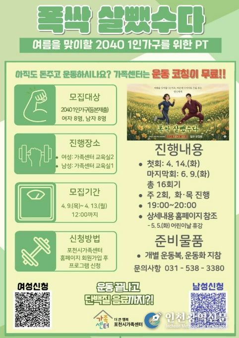 [인천광역신문] 최예준 기자 | 포천시 더 큰 행복 포천시가족센터는 2040 청년 1인가구의 건강한 생활 습관 형성과 신체적·정신적 건강 증진을 돕기 위해 성별 맞춤 운동 프로그램 ‘폭싹 살뺐수다’ 참여자를 모집한다.