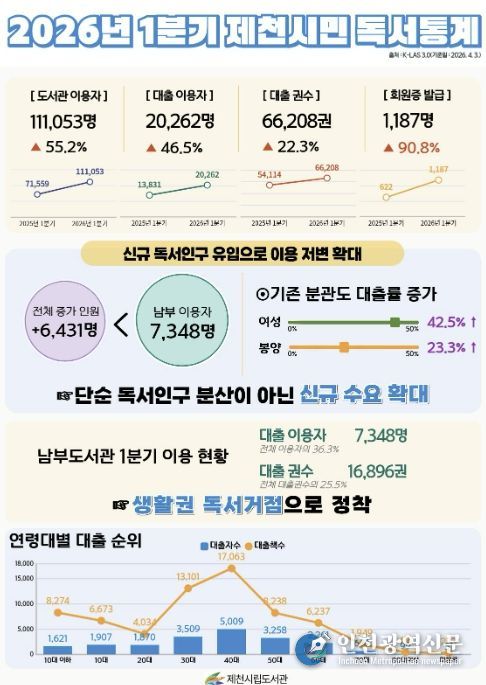 [인천광역신문] 최예준 기자 | 제천시립도서관이 2026년 1분기 시민 독서 이용 현황을 집계한 결과, 도서관 방문과 대출, 회원 등록이 전반적으로 증가하며 지역 독서 기반이 확대된 것으로 나타났다.