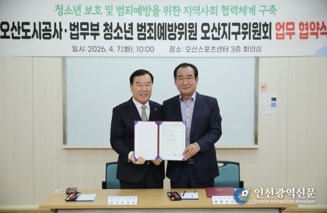 [인천광역신문] 최예준 기자 | 오산도시공사는 지난 7일 법무부 청소년범죄예방위원 오산지구위원회와 함께 오산시 아동·청소년의 사회 안전망 구축과 보호 강화를 위한 업무협약을 체결했다고 밝혔다.