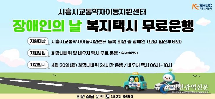 [인천광역신문] 최예준 기자 | 시흥도시공사는 오는 4월 20일 ‘제46회 장애인의 날’을 맞아 교통약자의 이동 편의 증진과 사회참여 확대를 위해 무료 운행 서비스를 제공한다고 밝혔다.