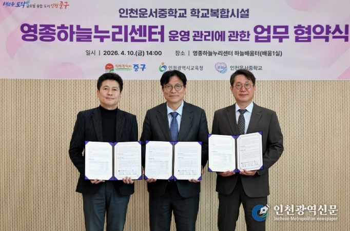 [인천광역신문] 최예준 기자 | 영종구 출범 원년을 맞아 올해 새롭게 개관한 ‘영종하늘누리센터’의 안정적·체계적 운영을 위해 인천시 중구가 인천시 교육청, 운서중학교와 손을 맞잡았다.