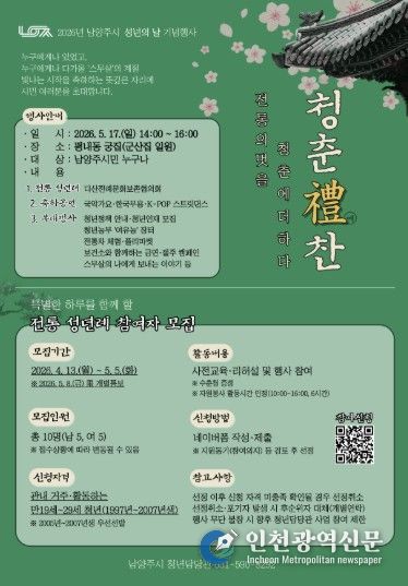 [인천광역신문] 최예준 기자 | 남양주시는 성년의 날을 앞두고 전통 성년례 행사에 참여할 청년을 모집한다고 10일 밝혔다.