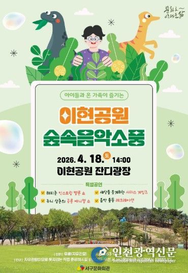 [인천광역신문] 최예준 기자 | 서구문화회관은 아이들과 온 가족이 다채로운 공연을 마음껏 누릴 수 있는‘이현공원 숲속음악소풍’을 개최한다. 14일부터 16일까지 서구 어린이집 및 유치원을 대상으로 단체 관람 프로그램을 진행하고, 18일에는 가족 대상 프로그램을 선보인다.
