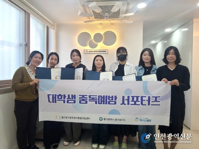 이날 울산중구중독관리통합지원센터는 제5기 중독예방 대학생 응원단(서포터스)으로 활동하게 된 지역 대학생 7명에게 임명장을 수여했다.