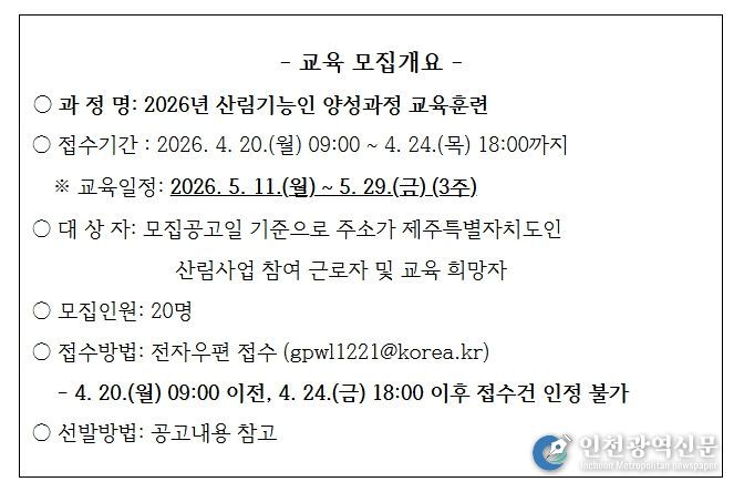 이번 교육은 5월 11일부터 29일까지 3주간 산림조합중앙회 제주지역본부에서 진행되며, 공고일 기준 제주도에 주소지를 둔 도민이면 누구나 신청할 수 있다.