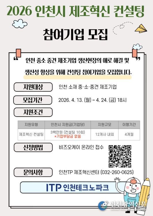 [인천광역신문] 최예준 기자 | 인천테크노파크(인천TP)는 지역 중소·중견기업 제조 현장의 스마트화와 AX(AI 전환)·DX(디지털 전환)를 촉진하기 위해 ‘2026 인천시 제조혁신 컨설팅 지원사업’ 참여기업을 24일까지 모집한다고 밝혔다.