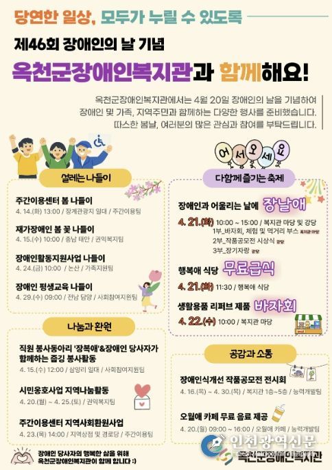 [인천광역신문] 최예준 기자 | 옥천군장애인복지관은 ‘제46회 장애인의 날’을 맞아 오는 4월 13일부터 30일까지 다양한 기념행사를 운영한다.