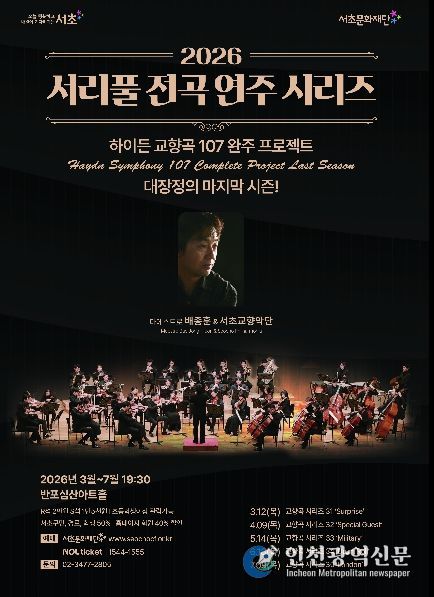 [인천광역신문] 최예준 기자 | 서초교향악단이 이어온 하이든 교향곡 전곡 연주라는 쉽지 않은 도전이 7년 만에 완주를 눈앞에 두고 있다. 서울 서초구(구청장 전성수)는 서초문화재단과 서초교향악단(예술감독 겸 상임지휘자 배종훈)이 추진 중인 '서리풀 전곡 연주 시리즈 – 하이든 교향곡 107곡 전곡 연주 프로젝트'가 오는 7월 대장정의 마침표를 찍는다고 밝혔다.