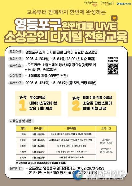 [인천광역신문] 최예준 기자 | 영등포구가 관내 소상공인의 온라인 판로 확대를 돕기 위해 ‘상반기 소상공인 디지털 전환 교육’을 개최하고, 오는 20일부터 참가자를 모집한다고 밝혔다.