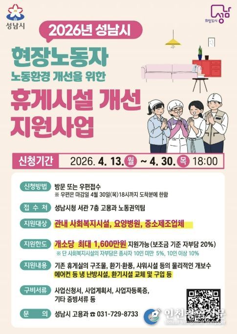 [인천광역신문] 최예준 기자 | 성남시는 휴게 여건이 열악한 민간 분야 현장노동자의 휴게권 보장과 노동환경 개선을 위해 사업장 휴게시설 개선 지원사업 참여기관과 기업을 추가 모집한다.