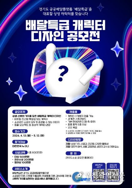[인천광역신문] 최예준 기자 | 경기도주식회사가 오는 5월 12일까지 공공배달앱 배달특급의 캐릭터 디자인을 공개 모집한다.