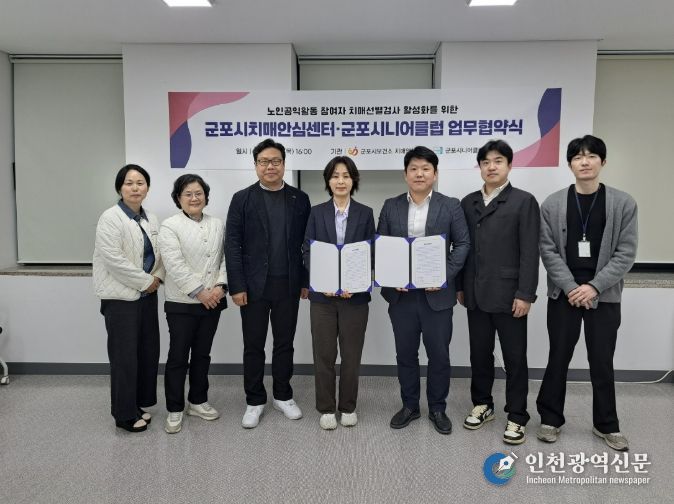 [인천광역신문] 최예준 기자 | 군포시치매안심센터는 4월 9일 군포시시니어클럽과 업무협약을 체결하고 노인공익활동 참여자를 대상으로 한 치매선별검사 확대에 나선다고 밝혔다.