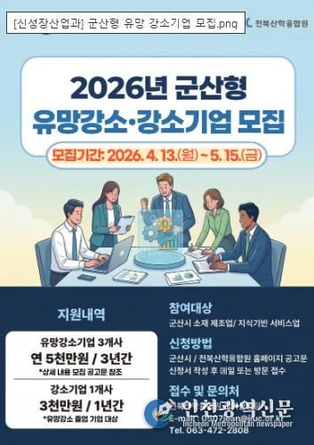 [인천광역신문] 최예준 기자 | 군산시가 지역 경제를 이끌어갈 ‘2026년 군산형 유망강소 및 강소기업’을 모집한다.