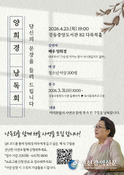 [인천광역신문] 최예준 기자 | 서울 강동문화재단은 4월 도서관 주간(4월 12일~4월 18일)을 맞아 지역 주민들이 책과 문화를 보다 가까이에서 접할 수 있도록 강동중앙도서관에서 다채로운 독서문화 프로그램을 선보인다고 밝혔다.