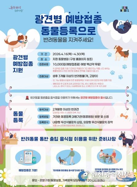 [인천광역신문] 최예준 기자 | 서울 성동구가 반려동물의 건강 보호와 광견병 예방을 위해 오는 4월 16일부터 ‘2026년 봄철 광견병 예방접종’을 실시한다고 밝혔다.