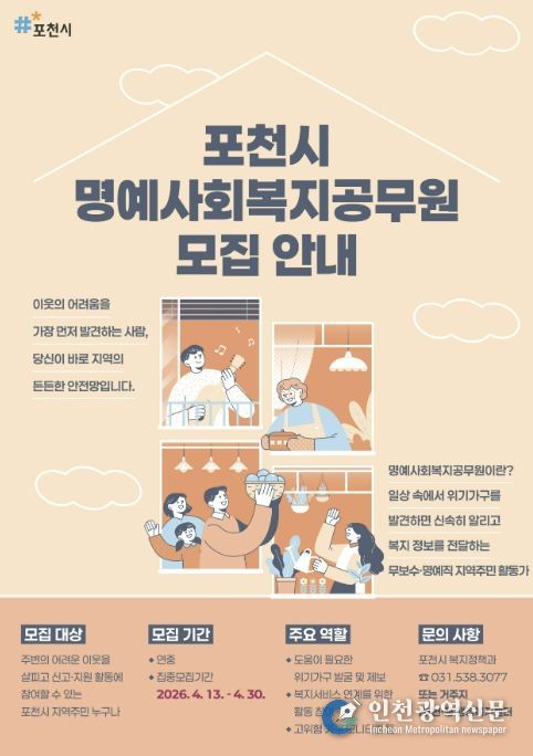 [인천광역신문] 최예준 기자 | 포천시는 복지사각지대 해소와 위기이웃 발굴을 위해 ‘명예사회복지공무원’을 오는 30일까지 집중 모집한다.