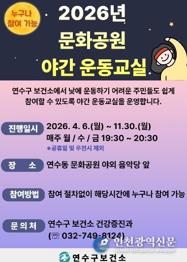 [인천광역신문] 최예준 기자 | 연수구 보건소는 이달부터 구민의 건강 증진과 일상 속 꾸준한 운동 습관 형성을 위해 문화공원에서 ‘야간 운동교실’을 운영한다.