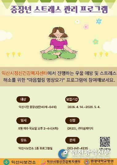 양찬모 익산시정신건강복지센터장은 "이번 프로그램을 통해 중장년층이 스트레스 관리 능력을 키우고 보다 건강한 삶을 이어가길 기대한다"며 "앞으로도 시민의 마음건강 회복을 위한 다양한 프로그램을 지속적으로 운영하겠다"고 말했다.