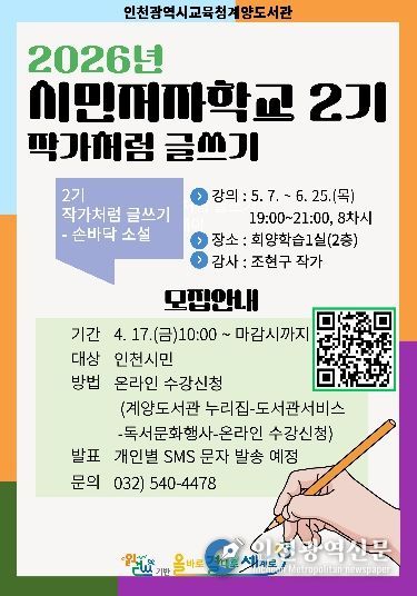 [인천광역신문] 최예준 기자 | 인천광역시교육청계양도서관은 시민의 글쓰기 역량강화와 창작 경험 지원을 위해, 2026년 시민저자학교 2기 ‘작가처럼 글쓰기-손바닥 소설’ 프로그램을 운영한다.