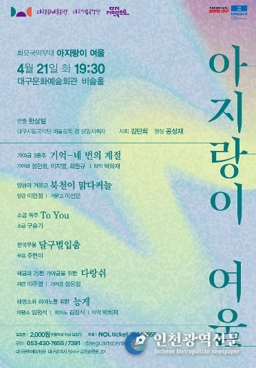 [인천광역신문] 최예준 기자 | 대구시립국악단 화요국악무대 '아지랑이 여울' 공연이 4월 21일 저녁 7시 30분 대구문화예술회관 비슬홀에서 펼쳐진다.