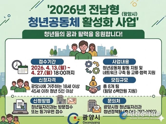 [인천광역신문] 최예준 기자 | 광양시는 4월 13일부터 4월 27일까지 ‘2026년 전남형 청년공동체 활성화 사업’에 참여할 청년공동체를 모집한다.