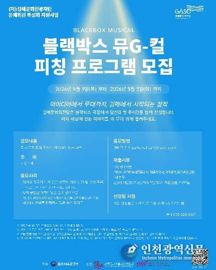 [인천광역신문] 최예준 기자 | (재)김해문화관광재단(대표이사 최석철) 김해문화의전당은 2026 문예회관 특성화 지원사업의 일환으로 ‘블랙박스 뮤G컬’ 피칭 프로그램을 운영하고 창작뮤지컬 초연으로 이어지는 30분 리딩 쇼케이스의 작품 공모를 진행한다.