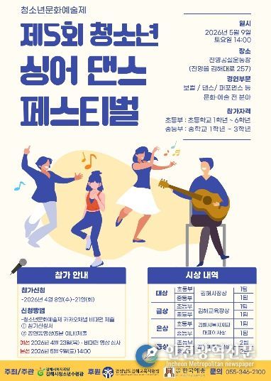 [인천광역신문] 최예준 기자 | (재)김해시복지재단(대표이사 임주택) 청소년수련관은 오는 5월 9일(토) 오후 2시부터 4시까지 진영운동장에서 청소년의 달을 맞아 ‘제5회 싱어댄스 페스티벌’을 개최한다고 밝혔다.