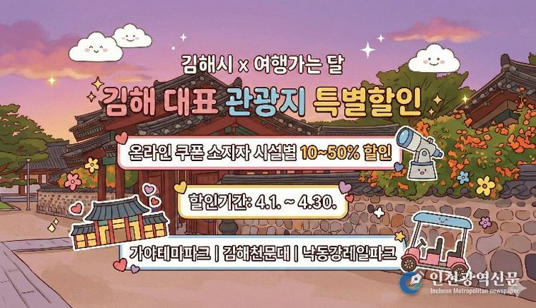 [인천광역신문] 최예준 기자 | 김해 주요 관광지 3곳이 문화체육관광부와 한국관광공사가 추진하는 ‘여행가는 달’과 연계한 할인 프로모션을 4월 한 달간 진행 중이다.