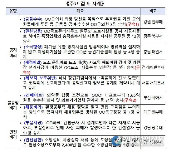 분야별 현황은 ① 공직비리 사범 998명(구속 36명) ② 불공정비리 사범 462명(구속 18명) ③안전비리 사범 537명(구속 2명)으로 나타났다.