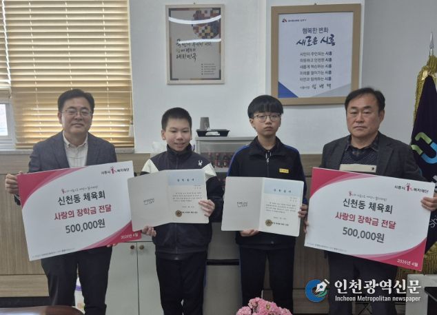 [인천광역신문] 최예준 기자 | 시흥시 신천동 체육회는 지난 4월 13일 신천동 행정복지센터에서 관내 신천중학교 학생 2명에게 장학금을 전달하며 따뜻한 이웃 사랑을 실천했다.