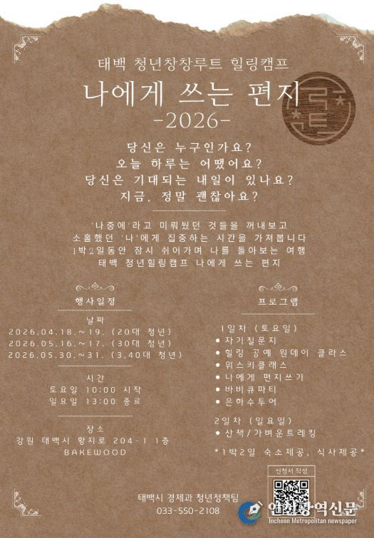 [인천광역신문] 최예준 기자 | 태백시는 4월부터 6월까지 지역 청년들의 역량 강화와 사회 참여 확대를 위한 ‘2026년 태백시 청년 리더 아카데미’를 운영한다고 밝혔다.