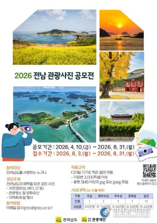 [인천광역신문] 최예준 기자 | 전라남도는 자연경관과 관광지, 축제 등 지역의 다양한 매력을 널리 알리고 수준 높은 사진 콘텐츠를 발굴하기 위해 ‘2026년 전남 관광사진 공모전’을 추진한다.